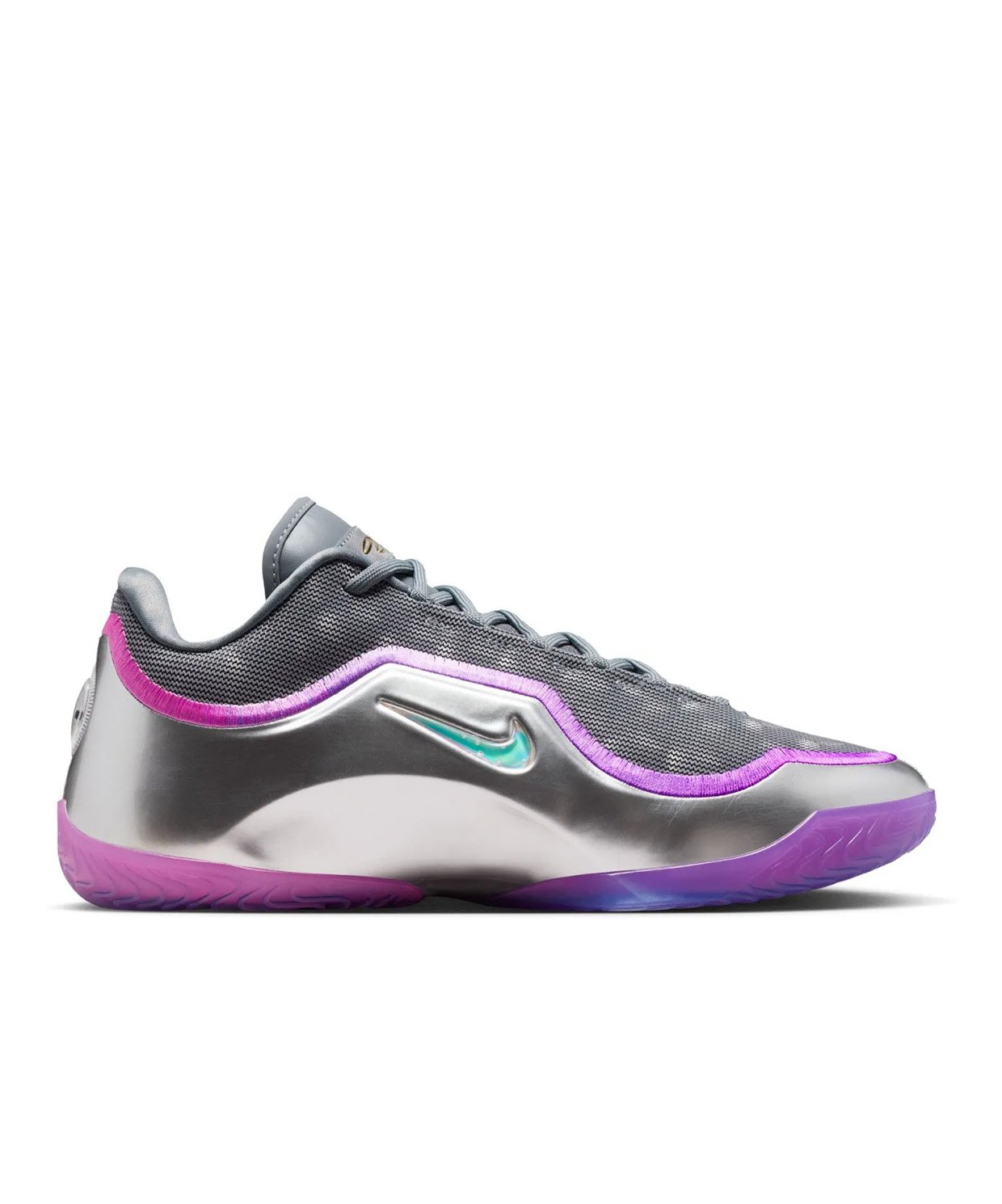 رنگبندی این کفش ترکیبی از خاکستری متالیک براق و بنفش کلاسیک تیم لیکرز است. نکته متمایز کننده، لوگوی نایک (Swoosh) است که به صورت جواهرنشان و حبابی با رنگ آبی فیروزهای طراحی شده؛ رنگی که احتمالاً به حال و هوای دنیای دیزنی (محل برگزاری مسابقات در اورلاندو) اشاره دارد. همچنین برندینگ حبابی روی پاشنه، مستقیماً به نام این نسخه اشاره میکند.