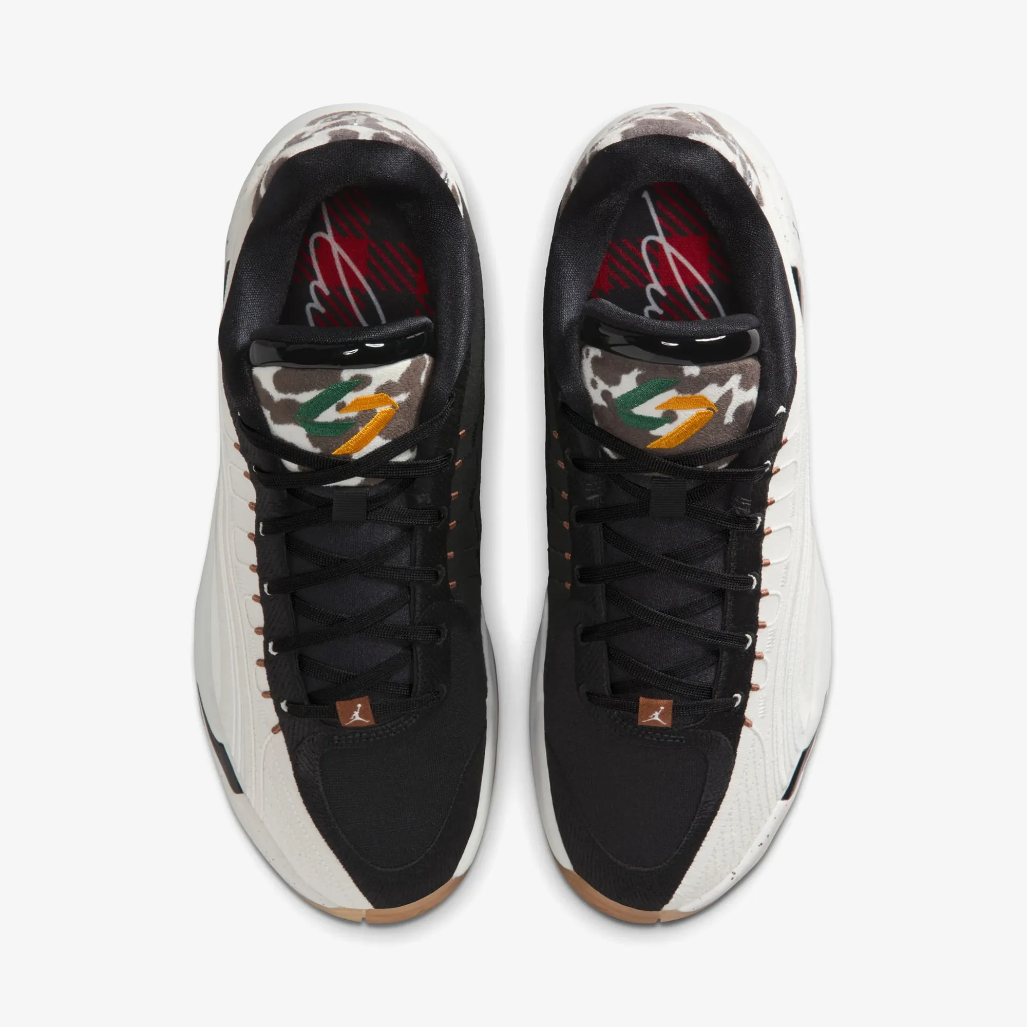 | پالت رنگی | جیر طرح پوست گاو قهوهای روی زبانه و پاشنه، لوگوی لوکا به رنگ سبز و زرد، چاپ شطرنجی قرمز و مشکی در کفی، رویه مشکی و کنارههای سفید، زیره میانی سفید با لکههای مشکی، و زیره صمغی (Gum Tread) قهوهای روشن. |