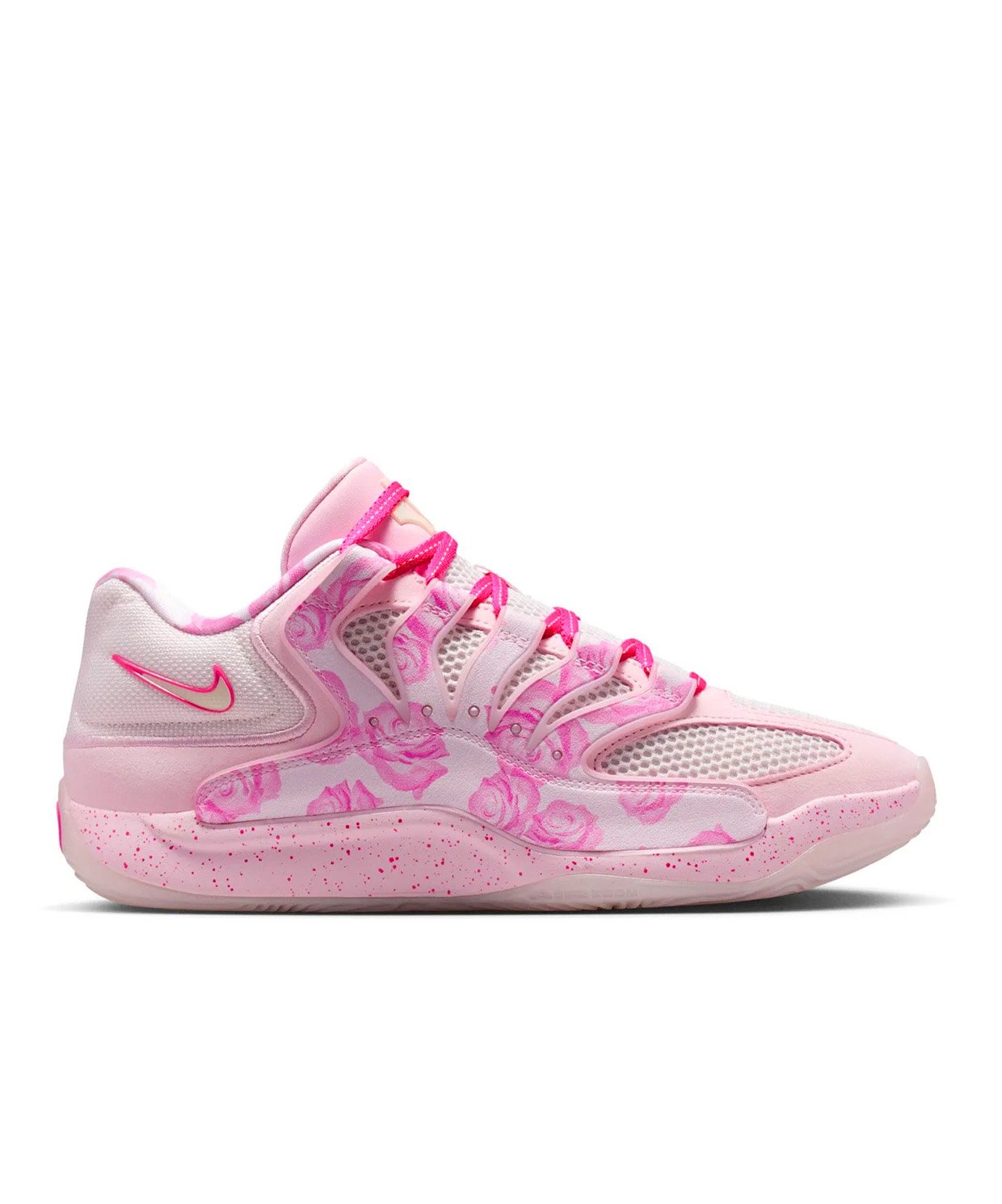 این مدل با ترکیبی آرامشبخش از رنگ صورتی روشن، جزییات طرح گُل رز را روی پنل کناری شبیه به قفس نمایان میکند که در عین حال به عنوان سوراخهای بند عمل میکند. زیره میانی دارای لکههای صورتی داغ است و لوگوی KD روی زبانه و Swoosh پاشنه به رنگ سفید شیری (Coconut Milk) دیده میشود که ظاهری باوقار به کفش میبخشد. زیره کفش نیز از جنس صمغ شفاف است که طراحی را تکمیل میکند.